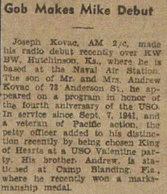 | Joe's brother Andrew also served during World War II as this article from a 1945 Raritan Valley News Shows |