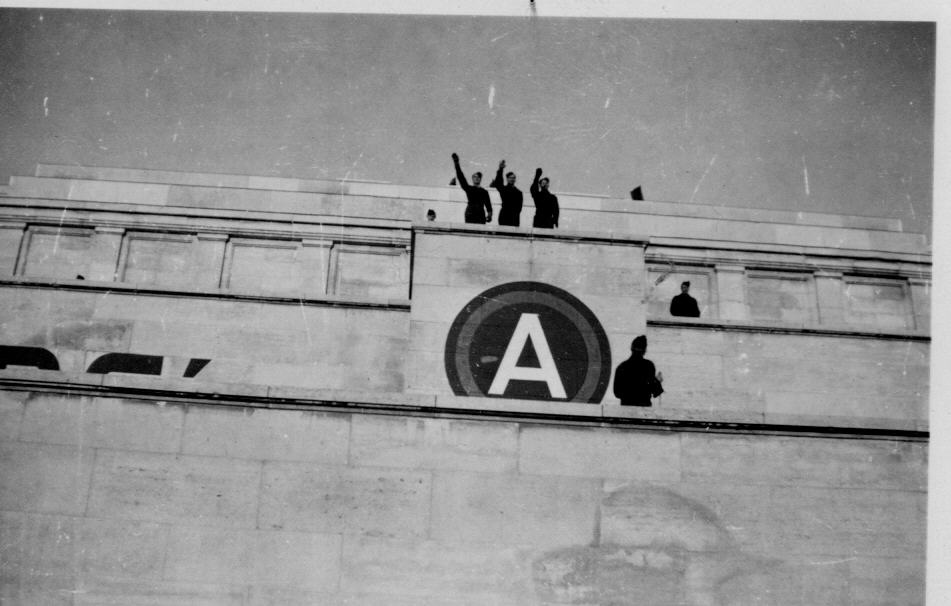 in a stadium in Germany on the balcony where Hitler had previously given several speeches.